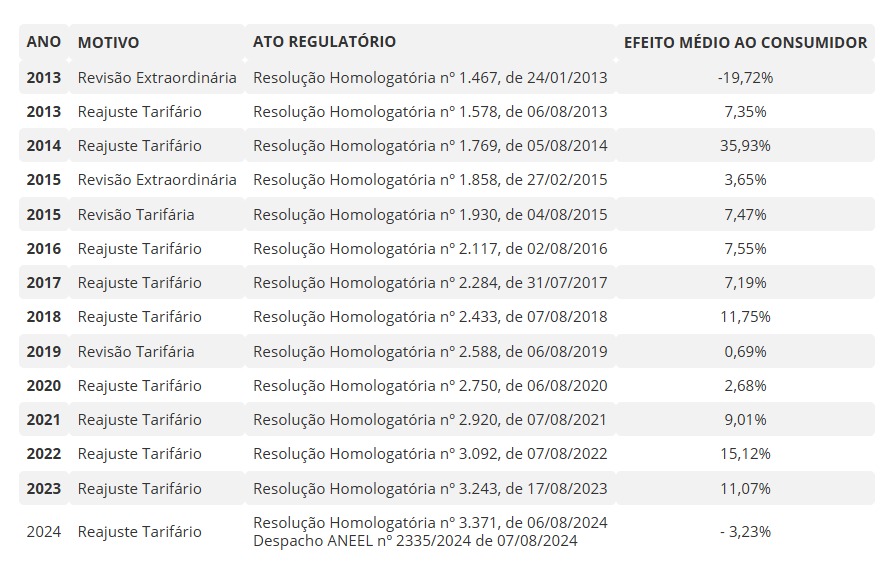 Mesmo com o aumento, o índice é menor em relação a anos anteriores. Em 2021, o reajuste foi de 9,01%; em 2022, 15,12%; e em 2023, chegou a 11,07%. No ano passado, os consumidores do Pará chegaram a ter uma redução média de 3,23% na tarifa. Veja:
